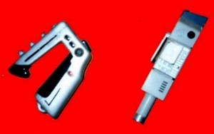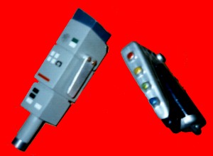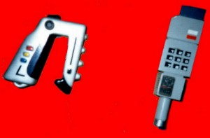 Original studio comlock and stun gun. The studio models varied considerably in size and detailing even on the "hero" props used for close-ups such as these; extras were given very rough versions. Sorry, larger views not available
